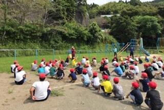 放送が入ったら、運動場にいた子供たちは中央に集まってしゃがんでいました。