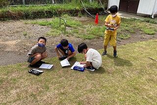 3年の理科の学習で、昨年度まで仮設運動場として使っていた場所に昆虫を探しに行きました。