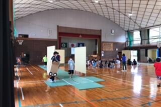 体育館でついたてを使って、見通しの悪い交差点の渡り方を中心に行いました。