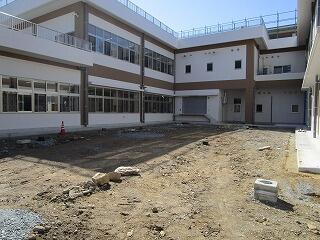 業者の方が運動場との境目に柵を作ってくださったので、子どもたちは安全に児童玄関から出入りすることができるようになりました。