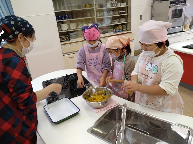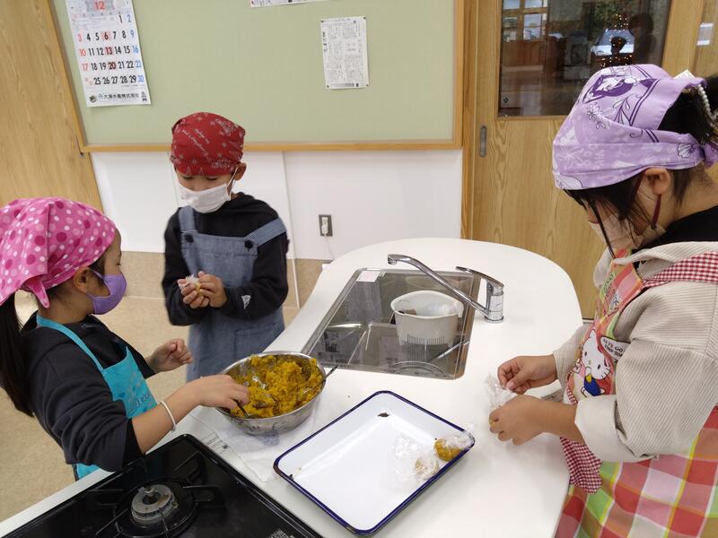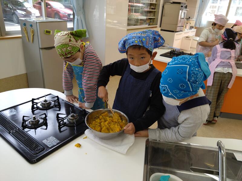 自分たちの掘ったお芋を使って、いもきんちゃくを作りました♪