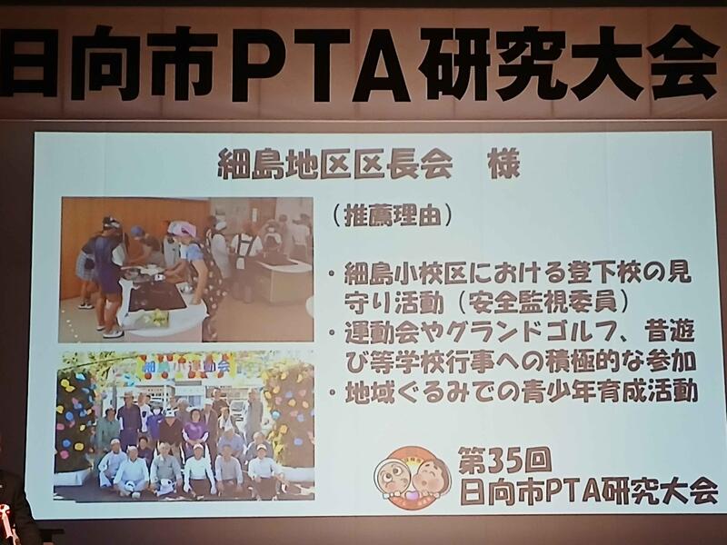 開会行事で、本市のPTA活動に協力していただいている団体様及び個人様の表彰があり、細島地区長会様が表彰されました。登下校の見守り、校外学習の協力、運動会での正門飾りつけ等の協力的な活動が認められたとのことです。