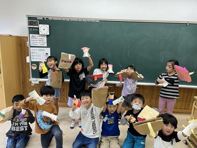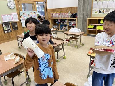 図画工作の時間に、紙袋や紙コップを使って