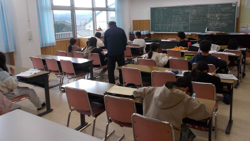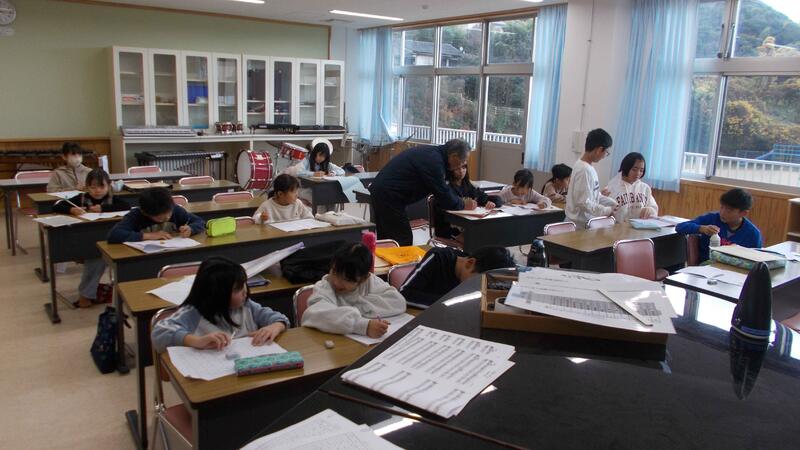 冬休みになり、今年も地域の方を塾長としての「あらぶる学習塾」が開設されました。場所は公民館2階の音楽室で、午前10時から正午までの2時間です。今日は14名の児童が主に「冬休みの宿題」に取り組んでいました。分からない問題があれば塾長にたずね、宿題をどんどんと進めていました。