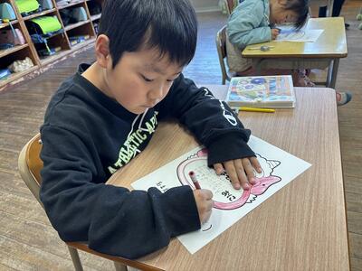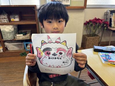 1年生の教室をのぞいてみると、どんな鬼を追い払うかをそれぞれ考え、鬼のイラストに書き込んでいました。