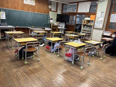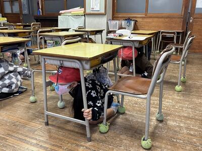突然、放送からアラートが鳴り始めてびっくりした子どもたちでしたが、しっかりと机の下に身を隠し、放送をよく聞いていました。