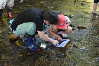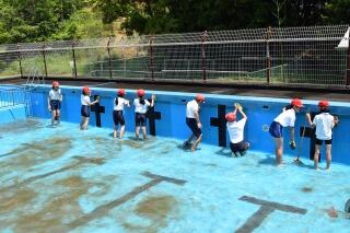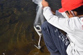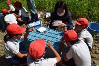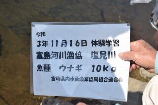 袋に入ったうなぎ10㎏を放流しましたが、透明度の高い水の中に入ると石の陰に隠れてしまい、あっという間に見えなくなってしまいました。その後、うなぎは産卵のために一度海へ出てまた戻ってくること等の説明を聞きました。うなぎがいつでも戻ってこられるきれいな川にしておきたいという気持ちを抱いた児童も多かったようです。