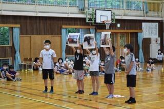 2~6年生がそれぞれ学習や登下校のきまり、給食や掃除の方法等について1年生に教えるというスタイルでの発表を行いました。1年生からは、覚えたての校歌の発表がありました。各学年の工夫により、楽しい時間を過ごすことができたようです。
