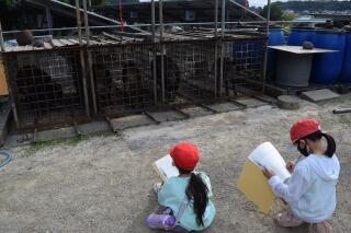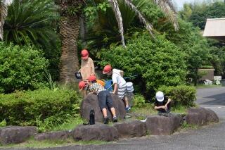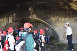 最初の見学地は宮崎空港の近くにある掩体壕(えんたいごう)です。これは、戦時中航空機や車両などを守るために覆ったり囲ったりする目的で作られたものです。宮崎特攻基地慰霊碑もあり、宮崎特攻基地慰霊碑奉賛会の方々が説明をしてくださいました。戦争は悲惨なものであり絶対にしてはならないという内容に、子どもたちも真剣な表情で聴き入っていました。