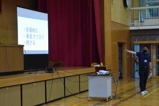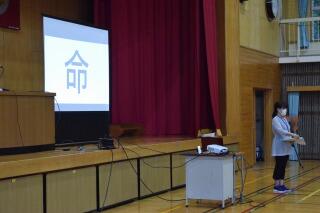 今朝、全校集会を行いました。宮崎県にまん延防止等重点措置が適用されていた期間はオンラインで行っていたため、久しぶりの体育館での実施でした。内容は、「塩見作法」についてでした。本校では、「礼」「あいさつ」「返事」「挙手」「廊下歩行」について、年度当初に児童に具体的な指導をしており、それを「塩見作法」と呼んでいます。それらがきちんと実践できているか、プログラム委員会の児童が全児童を対象にアンケートをとり、点数化したものを教務主任が子どもたちに紹介しました。一番よかったのは、「挙手」(腕を伸ばしてまっすぐ挙げ、耳に付ける)で90点、次に「礼」「あいさつ」の87点、「返事」の80点と続き、一番よくなかったのは「廊下歩行」の76点でした。それぞれの項目を、これから100点に近づけるにはどうすればよいかを一人一人心の中で考えて集会を終えました。