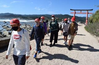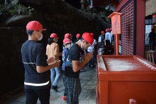 10月28日(木)、快晴の空の下、塩見小学校6年生の修学旅行はスタートしました。1日目の行き先は、日南市の飫肥城、鵜戸神宮、サンメッセ日南です。飫肥城では班別の自由研修を行い、小村寿太郎記念館等を訪れました。鵜戸神宮では、参拝の後、運玉投げにも挑戦し、1投目で入ると歓声が上がりました。サンメッセ日南のモアイ像は雲一つ無い空によく映え、素晴らしい景色に癒やされました。
