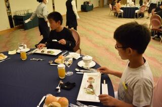 1日目の行程を終えた一行が向かったのは宿泊するシェラトン・グランデ・オーシャンリゾート。噂通りの素晴らしいホテルでした。夕食はディナーのコース料理で、はじめにテーブルマナーを教えていただきました。味も最高で、子どもたちからも、「おいしい。」という言葉が何度も聞かれました。