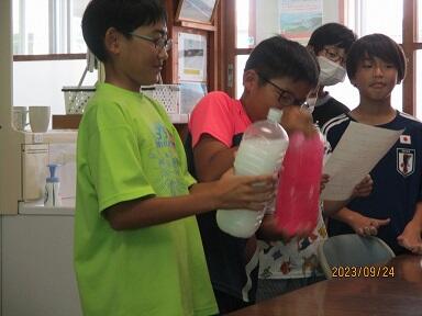 その後、いよいよ団の色を決めました。各団の団長が、透明の液体が入ったペットボトルを手に持ち、思い切り振ってまいると、あら不思議。それぞれ白と赤に変化して団の色が決まりました。いよいよ本格的にスポーツフェスティバルの練習が始まります。楽しみですね。