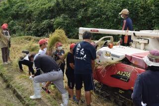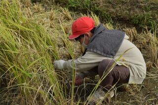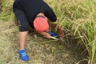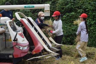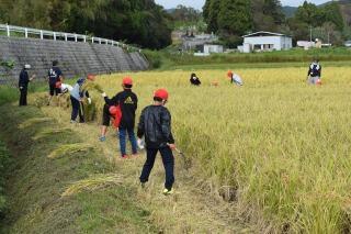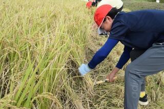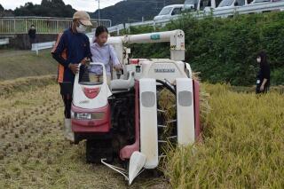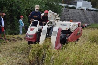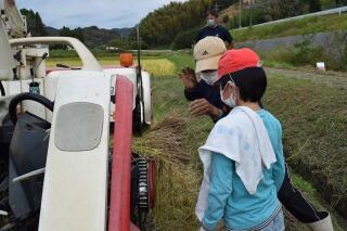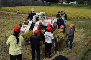 薄曇りであまり暑くないという絶好の天気に恵まれて、5年生が稲刈りを行いました。稲の刈り方を教わった後、手に手に鎌を持ち、楽しそうに刈っていました。ある程度刈ったところでコンバインに乗せていただいて機械で刈っていき、結局8袋弱の餅米を収穫することができました。全員1回ずつ乗せてもらい、とても楽しかったようです。塩見まちづくり協議会やJA青年部の方々にご協力いただきました。本当にありがとうございました。