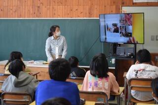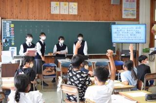 10月7日(金)5校時、4年生の教室に県立日向高等学校から2年生の生徒さん4名と引率の先生1名をお迎えし、若山牧水についての学習会を行いました。本校の4年生は、総合的な学習の時間に郷土の偉人若山牧水について学習していますが、日向高校の2年生も短歌を通した地域づくりに取り組んでいるというお話を4年担任が聞きつけ、高校生の発表を聞くことが大いに参考になるのではないかと企画したものです。