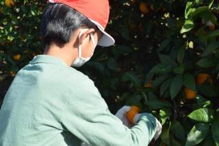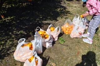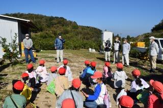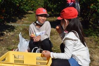 11月4日(金)、髙森山で3年生がみかん狩りを行いました。農地水の会のご協力の下、毎年3年生でさせていただいている行事です。みかんのちぎり方を教わった後、さっそくみかん狩りをさせていただきました。天気にも恵まれ、みんな楽しそうに袋いっぱいにちぎり、途中で食べて味わっている子どもたちもいました。最後には、ご協力くださったみかん農家の方のお話を聞き、栽培方法や苦労、工夫などの質問にも答えていただきました。収穫したみかんは個人で持ち帰ったほか、全学年の児童にもお裾分けしました。