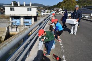 11月8日(火)、塩見川に架かる瀬の口橋で2年生がしじみの放流を行いました。3年生のみかん狩り同様、農地水の会のご協力の下毎年行われている行事です。子どもたちは橋の上から川に向かって、「大きくなれ。」と言いながらしじみを投げ入れていました。近年、河川の汚染により、しじみの収穫量が減ってきているそうです。子どもたちには川を汚さないようにとお願いをされていました。こうした行事を通して、子どもたちが環境問題を考えふるさとを大切にしようとする気持ちをもってくれることを願っています。