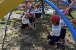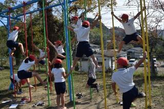 4校時、2年生体育の授業の様子です。遊具を使ってぶら下がってじゃんけんをしたり、登り棒に登ったりと、楽しそうに学習しています。