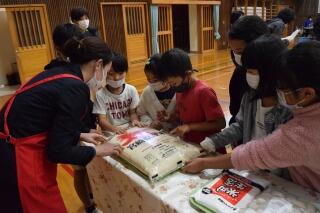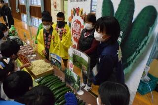 11月18日(金)、4校時に体育館で標記の会が行われました。これは、宮崎県学校給食会主催の行事で、県産の食材や加工開発品を取り入れた交流給食を行うとともに、児童と生産者との交流や展示を実施することで、学校給食を通した食育・地産地消への理解促進を図ることを目的としています。今日は4つの生産者団体の方々にお越しいただき、それぞれのブースを子どもたちが縦割班でまわり、説明を聞いたり、体験をしたりして楽しみました。5年生は総合的な学習の時間でSDGsについて学習していますので、事前に準備をし、各ブースでアシスタントとして活躍しました。子どもたちは給食を通して多くの方々にお世話になっていますが、こうして食材の生産者の方々と直接触れ合うという機会は滅多にありませんので、とてもいい経験になったことと思います。こうした行事を通して、子どもたちが食に対する関心を高め、感謝の気持ちをもつことを期待しています。