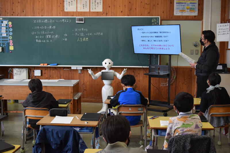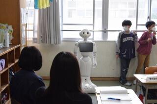 4校時、4年生で防災教育が行われました。今日の講師はAIロボットペッパー君です。ペッパー君にプログラミングされた内容をモニターに映し出し、ペッパー君が音声と動きで説明するという内容でした。津波とはどういう波なのか、起こる原因は何なのかなどとても分かりやすく、4年生も見て聴いて考えて、充実した授業になったようです。今後、職員のICT研修で紹介し、多くの学年で実施していきたいと考えています。
