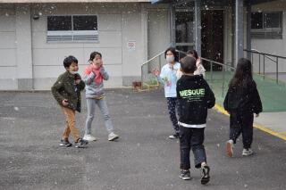 1月24日から25日にかけて、10年に1度の最強寒波が日本列島を包み込むと天気予報が伝えていましたが、24日(火)、予報通り日向市でも雪が舞いました。昼休みから舞い始めためずらしい雪に子どもたちは大はしゃぎ。寒さをものともせず中庭で駆け回っていました。