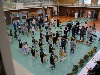 3月30日、定期異動により本校を転出する職員の離任式が行われました。あいにくの曇り空でしたが、校庭の桜はほぼ満開に近く、新たな門出を祝っているかのようでした。今年度転出するのは4名です。まず職員室で職員とのお別れをし、その後体育館で児童とのお別れをしました。子どもたちからは、「お世話になりました。」「ありがとうございました。」という声が聞かれました。4名の先生方の、新天地でのご活躍をお祈りします。