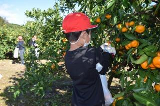 11月10日(水)、3年生は農地水の会のご協力の下、みかん狩りを行いました。黒木さんのみかん山にバスで移動した後、みかんのちぎり方を教わり、思い思いの場所でみかんを収穫しました。もう収穫の時期は過ぎているそうですがとてもあまく、子どもたちも時折手を止めてみかんを食べ、「あまい。」「おいしい。」を連発していました。収穫後は子どもたちの質問にも丁寧に答えていただきました。子どもたちは袋いっぱいにみかんを詰め込んでみかん山を後にし、大満足のようでした。他の学年の子どもたちや職員にもお裾分けをいただきました。