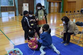 11月22日(月)、2・3校時の生活科の時間に、1年生の地域交流が行われました。地域の高齢者に来校してもらい、日本に昔から伝わる遊びを教わり、楽しく遊んだり交流したりすること、児童に地域の高齢者に対する感謝及び尊敬の気持ちを育てることを目的としています。「こま」「めんこ」「けん玉」「おはじき」「お手玉」「あやとり」の中から、4つ選び、順番に回って遊びを教わりました。「こま」のブースでは、名人級の技を披露してくださる方もいらっしゃって、子どもたちからも「すごい。」という声が上がっていました。