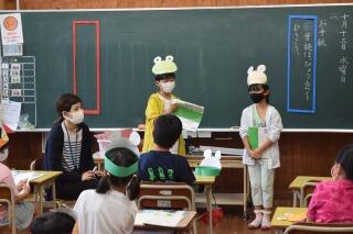 2年生は国語の時間に単元「お手紙」の音読発表会を行いました。二人一組になって、かえるくんとがまくんの会話文を読み、地の文は教師が読むという方法です。これまでの授業で、かえるくんやがまくんの心情を考えながら書き込みをしてきたためか、どの児童も気持ちを込めたり読む速さや強さに気を付けたりと表現豊かに読むことができていました。
