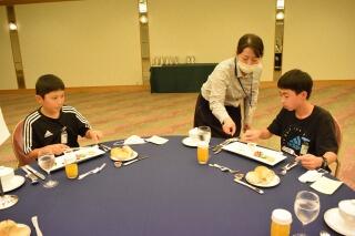 1日目の行程を終えた一行が向かったのは宿泊するシェラトン・グランデ・オーシャンリゾート。噂通りの素晴らしいホテルでした。夕食はディナーのコース料理で、はじめにテーブルマナーを教えていただきました。味も最高で、子どもたちからも、「おいしい。」という言葉が何度も聞かれました。