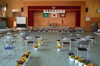 午後、3年生以上の児童と職員とで明日の卒業式に向けての準備を行いました。昨年度は3月に入るとすぐに臨時休校となり、練習もほとんどできず、ぶっつけ本番の卒業式でした。それを思うと、まだ縮小しているとはいえ通常に近い形での卒業式が行えることを喜びたいと思います。