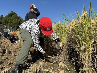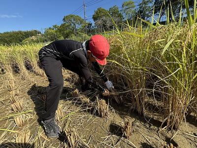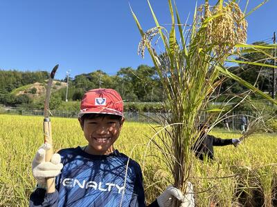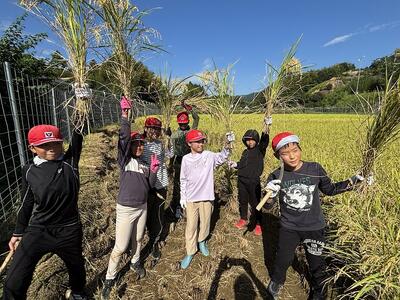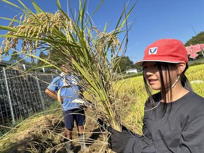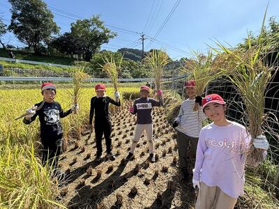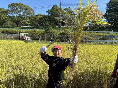 10月1日、秋晴れの下、5月に植えたもち米の稲刈りが行われました。