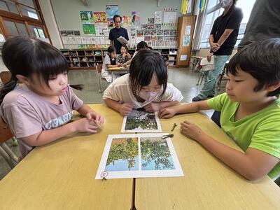 写真を使って、接木して2年目、5年目、10年目の生長の様子を紹介してくださいました。子どもたちは興味津々です。