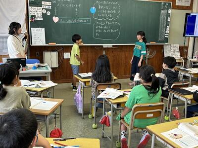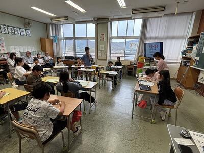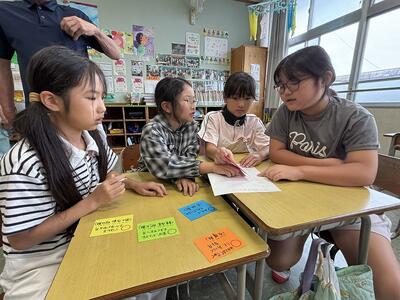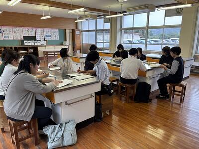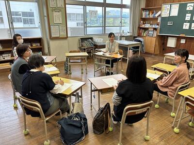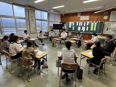 提供した授業をもとに、富高小や日向中の先生方と指導法や授業の構成について話し合いを進めました。