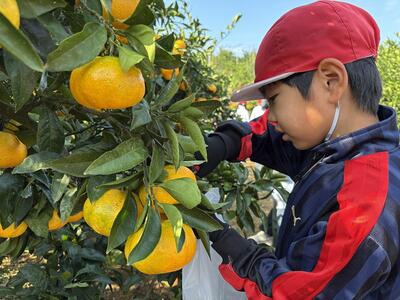 試食もオッケーということで、ちぎりたてのみかんをほおばってみると、みずみずしくてジューシーで、とっても美味!