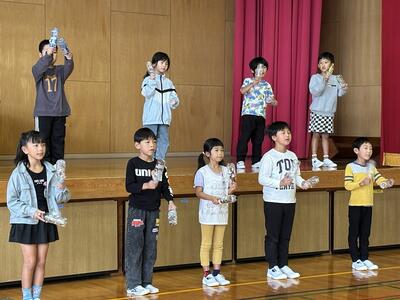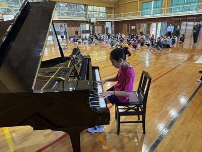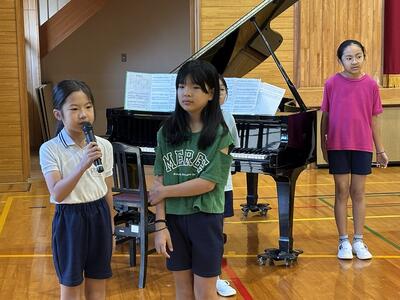 在校生は発表を見ることができないため、今日、全校児童の前でリハーサルを行いました。