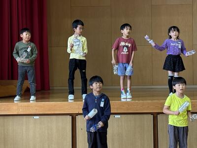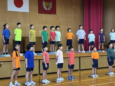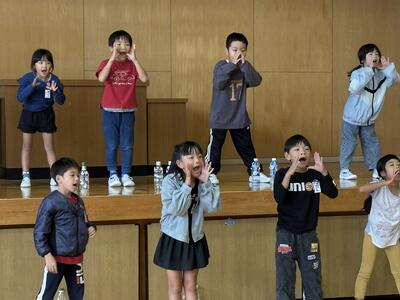 今日は、1・2年生が体育館で発表の練習をしていました。