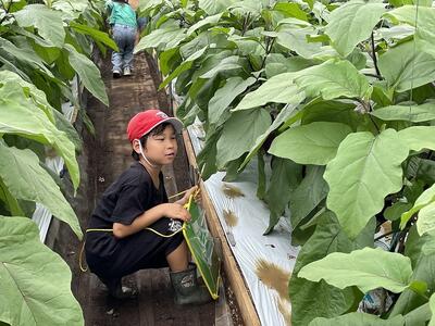 子どもたちは、大きな葉っぱをめくったり、下からのぞき込んだりしながら、ナス探しです。