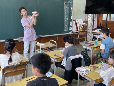 学校医でもある田村歯科の歯科衛生士さんにおいでいただき、歯ブラシの使い方やうがいの仕方などを詳しく教えていただきました。