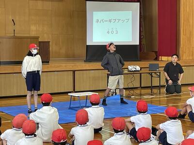 さて、子どもたちは明後日の運動会に向けて昼休みに全校のみんなで応援の練習をしていました。子どもたちの声が運動場に響き渡っていました。