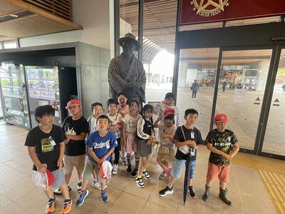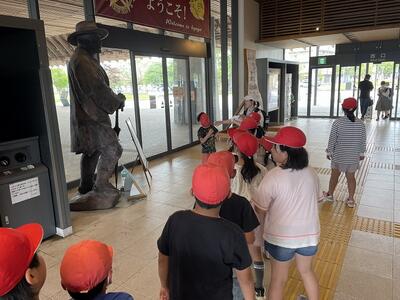 市立図書館や市役所、日向市駅の見学です。写真は、日向市駅の牧水像の前でパチリ。