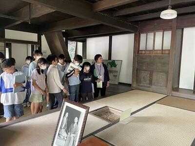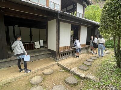 市の「ふるさと再発見」事業で、若山牧水記念文学館や中島美術館に行き、日向のすばらしさを体感しました。写真は牧水の生家を見学している様子です。