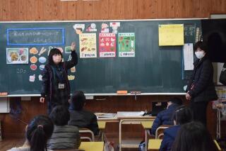 1校時、2年生の生活科で、「食べもののひみつをしらべよう」という授業が行われました。赤・黄・緑に分類された食物にそれぞれどのような働きがあるのかを知り、健康に過ごすためにはどの色の食材も入るようにバランスよく食べることが大切であるということを学ぶ内容でした。栄養教諭がスライドやクイズを出しながら進め、担任がそれを補佐するTTの授業で、子どもたちは興味深そうに取り組んでいました。