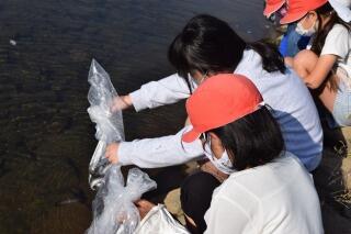 袋に入ったうなぎ10㎏を放流しましたが、透明度の高い水の中に入ると石の陰に隠れてしまい、あっという間に見えなくなってしまいました。その後、うなぎは産卵のために一度海へ出てまた戻ってくること等の説明を聞きました。うなぎがいつでも戻ってこられるきれいな川にしておきたいという気持ちを抱いた児童も多かったようです。