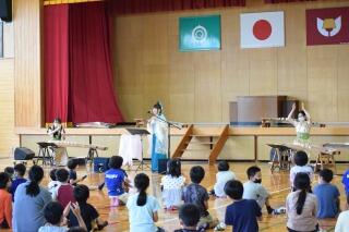 3・4校時、体育館で鑑賞教室が行われました。今年度は音楽鑑賞です。日向市平岩の笛箏ユニット「SKY」をお呼びし、笛と箏を使用した邦楽の演奏を楽しみました。代表的な邦楽「春の海」や「古城の月」に始まり、途中で代表児童が箏の体験をさせてもらう場面もありました。終盤には子どもたちのよく知っている「パプリカ」や「鬼滅の刃メドレー」「ルパン三世のテーマ」などの演奏もあり、あっという間の2時間でした。和楽器の演奏を聴く機会は滅多にないので、子どもたちにとって貴重な経験になったことと思います。こうした鑑賞教室を通して、子どもたちに美しい音色や素晴らしい演奏にあこがれる気持ち、感動する心を育てていきたいと思います。