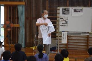 先週の金曜日、学校の行事として標記の学習を行いました。「戦争という歴史から学ぶ、考える」というテーマで、児童に命の尊さと平和について考えさせることがねらいです。本校は戦争当時、激戦地の沖縄から集団疎開という形で小学生が避難してきた事実があり、過去に交流も行われていたようです。4名の地域の方々を講師としてお招きし、低中高学年に分かれてそれぞれの発達段階に応じたお話をしていただきました。