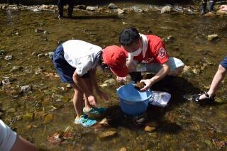 昨日の午前中、3年生は学校近くの奥野川で水生生物の調査を行いました。3年生は総合的な学習の時間に「日向市の地域・環境を知る」をテーマに学習しており、その学習の一環として計画したものです。市役所の環境政策課の方々や日向保健所の方々も現場にきて指導してくださり、安全に楽しく観察ができました。