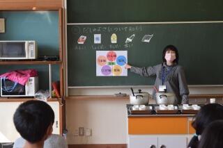 3校時、5年生は家庭科で、「だしのよさについて考えよう」という学習をしました。担任の先生と栄養教諭の先生とのティームティーチングで、だし入りのみそ汁とだしの入っていないみそ汁とを飲み比べて、その違いを話し合いました。だしを使うことで料理がよりおいしくなることや、塩分の取り過ぎの防止にもなること、日本のだし文化は世界的にも注目されていることなどを学んでいました。