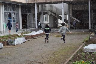 1月24日から25日にかけて、10年に1度の最強寒波が日本列島を包み込むと天気予報が伝えていましたが、24日(火)、予報通り日向市でも雪が舞いました。昼休みから舞い始めためずらしい雪に子どもたちは大はしゃぎ。寒さをものともせず中庭で駆け回っていました。