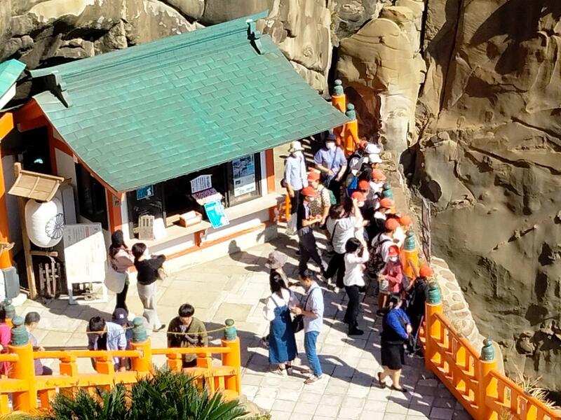 神社は海岸沿いの絶壁の洞窟の中にあり、朱塗りの色鮮やかな御本殿を前にして、子どもたちはたくさんのパワーをもらったようです。